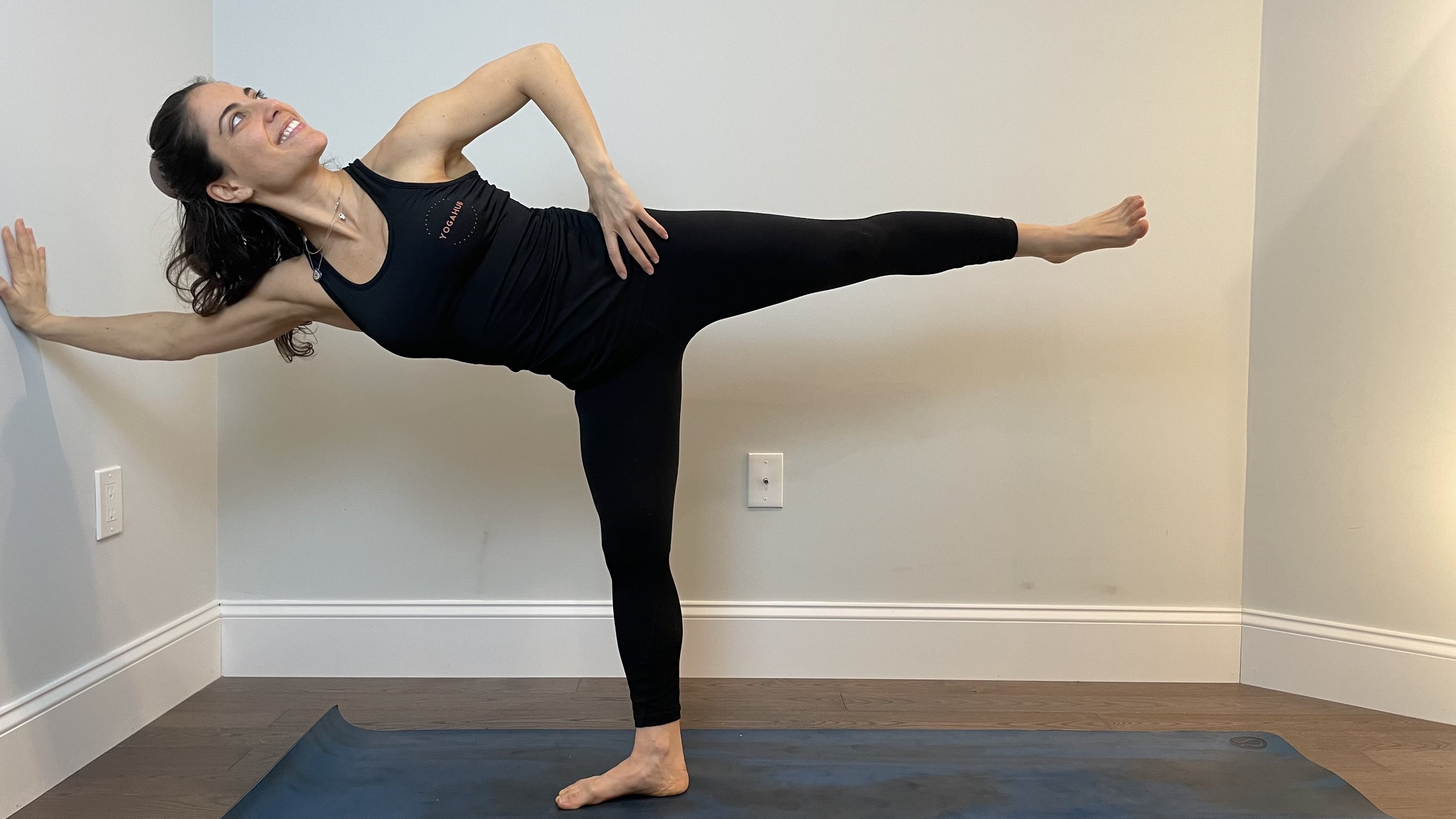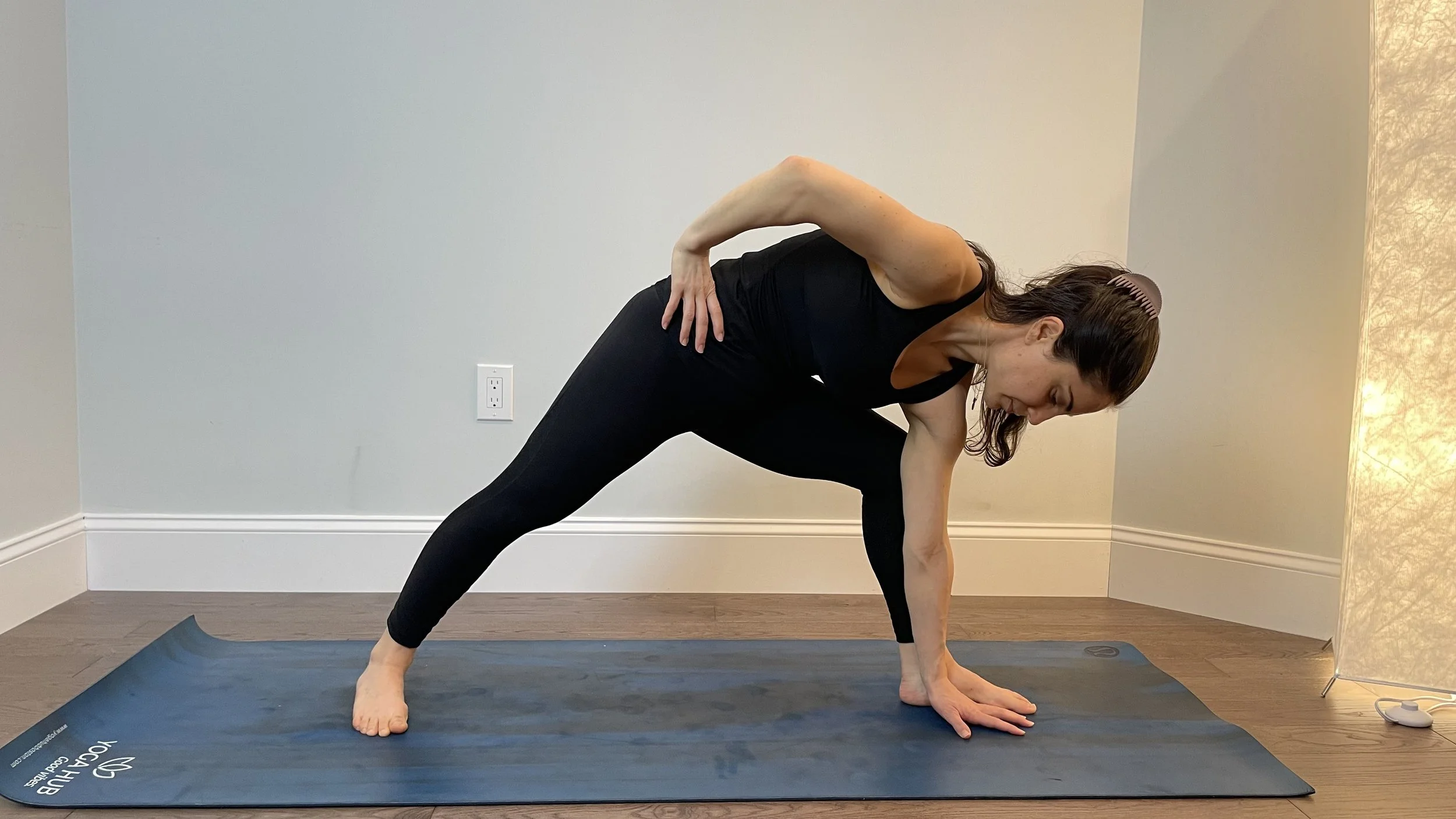 For example, if you’re working with tight hips in utthita parsvakonasana, bring a block under your bottom hand. That way you can reach the ground and leverage up from it without having to round your back or swing your hips behind you.