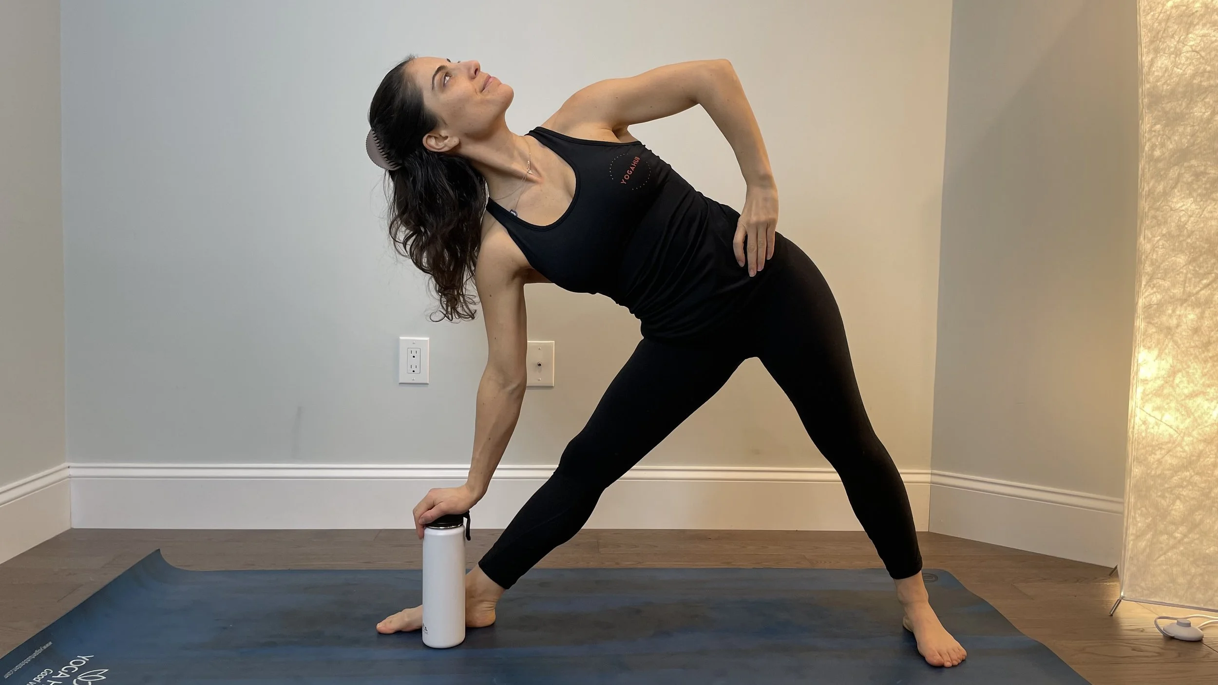 In some cases (like trikonasana pictured below), a sturdy water bottle will make due if you don’t have blocks lying around.