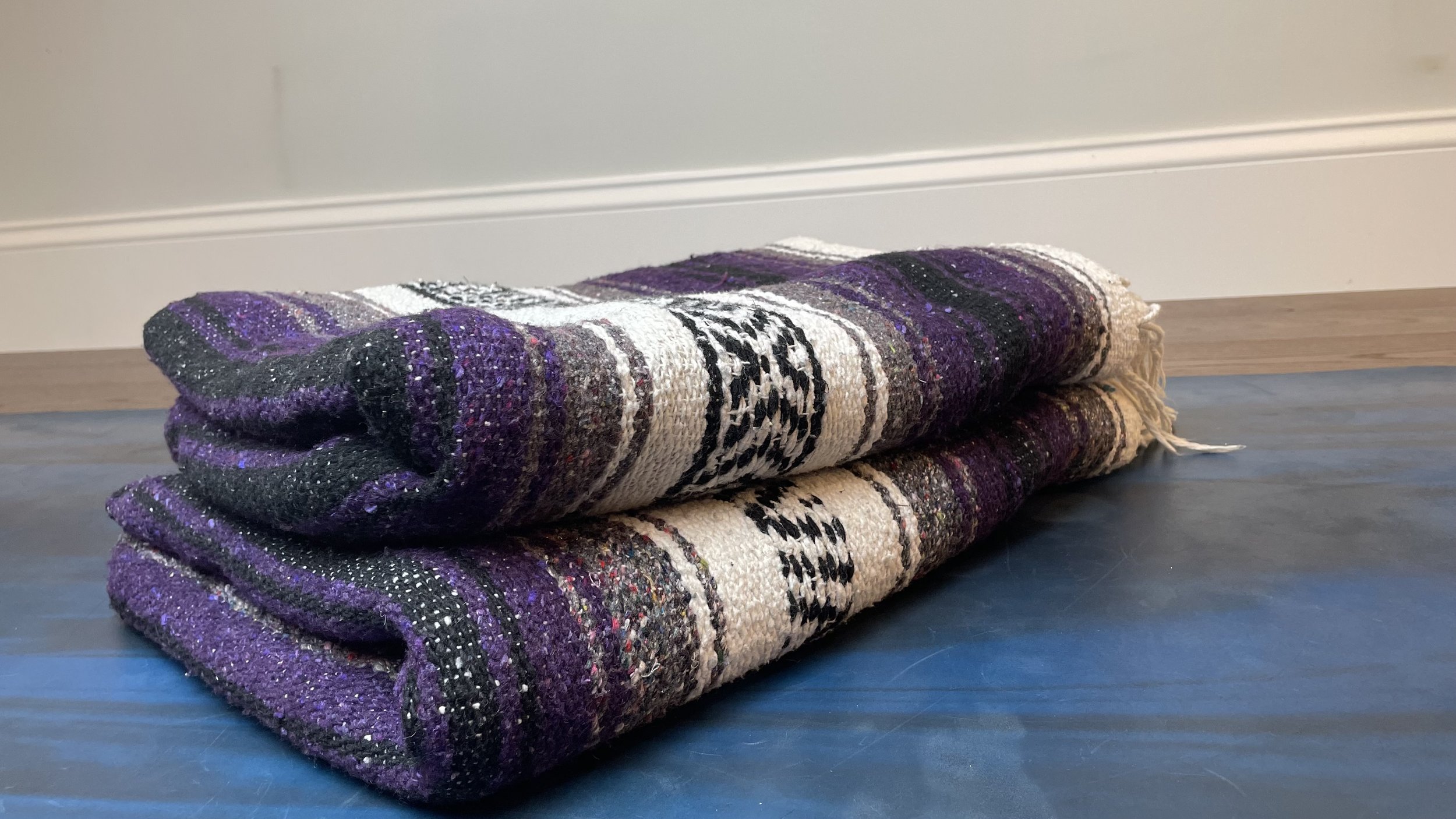 Most studios provide the Mexican blankets because they’re thick, easily foldable, and give height. If you don’t have this type of blanket at home, usually towels have the same qualities. Throw blankets tend to have less lift than thicker blankets or towels.